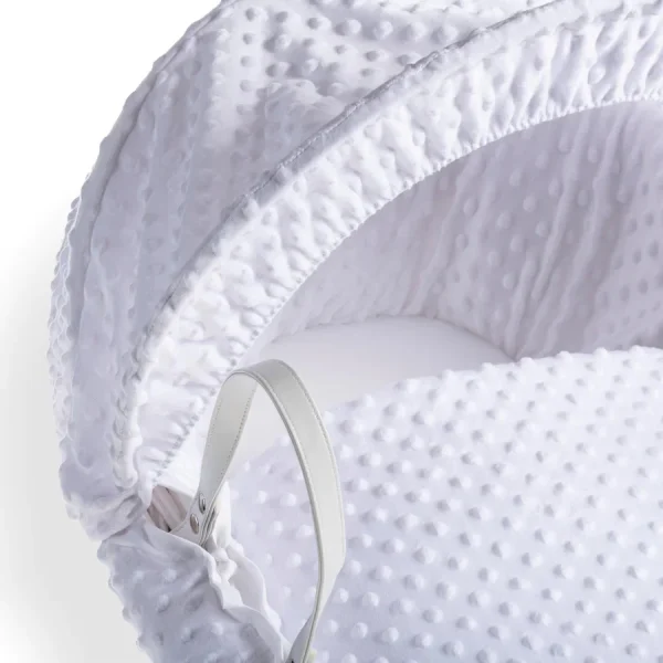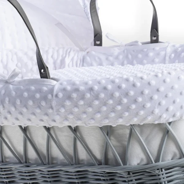 A sturdy and lightweight wicker Moses basket with the super-soft, plush dot Dimple fabrics that create a super cosy sleeping space for your baby.