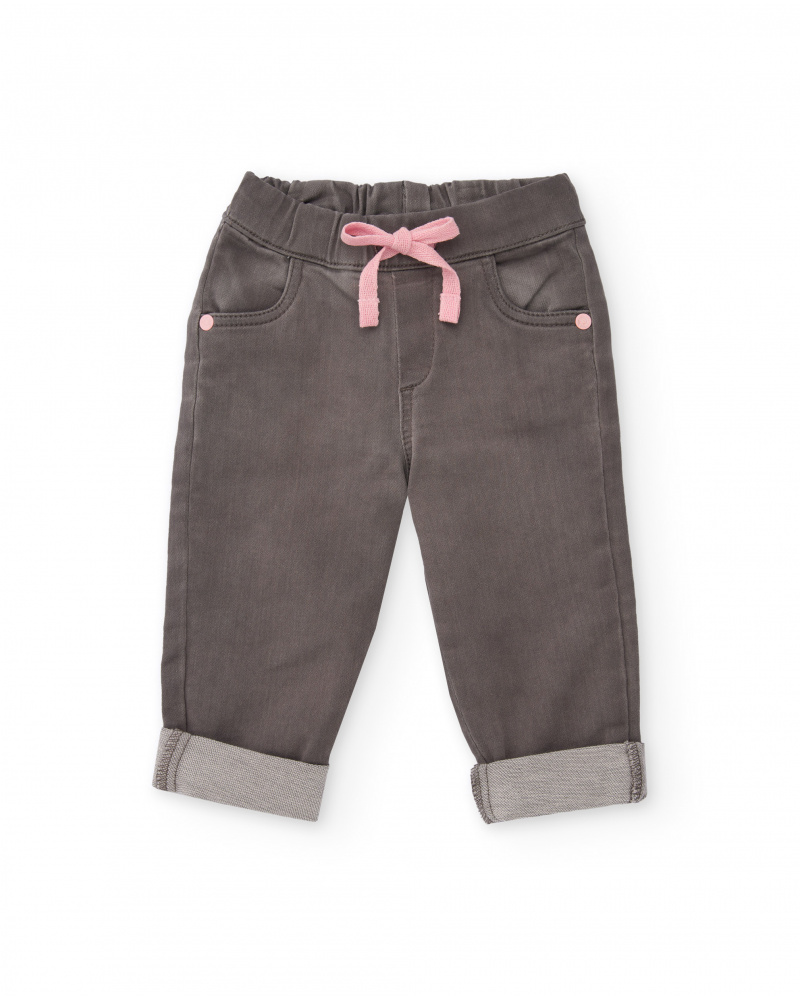 Baby girl outfit that includes a long-sleeve pink blouse with a cute penguin print surrounded by hearts, and gray pants with a comfortable cut and an elastic waistband for easy changing. The blouse features a peplum design and snap buttons on the back for effortless dressing. The pants offer adjustable hems that grow with your little one. Made of soft cotton, this outfit ensures comfort and style for any occasion.