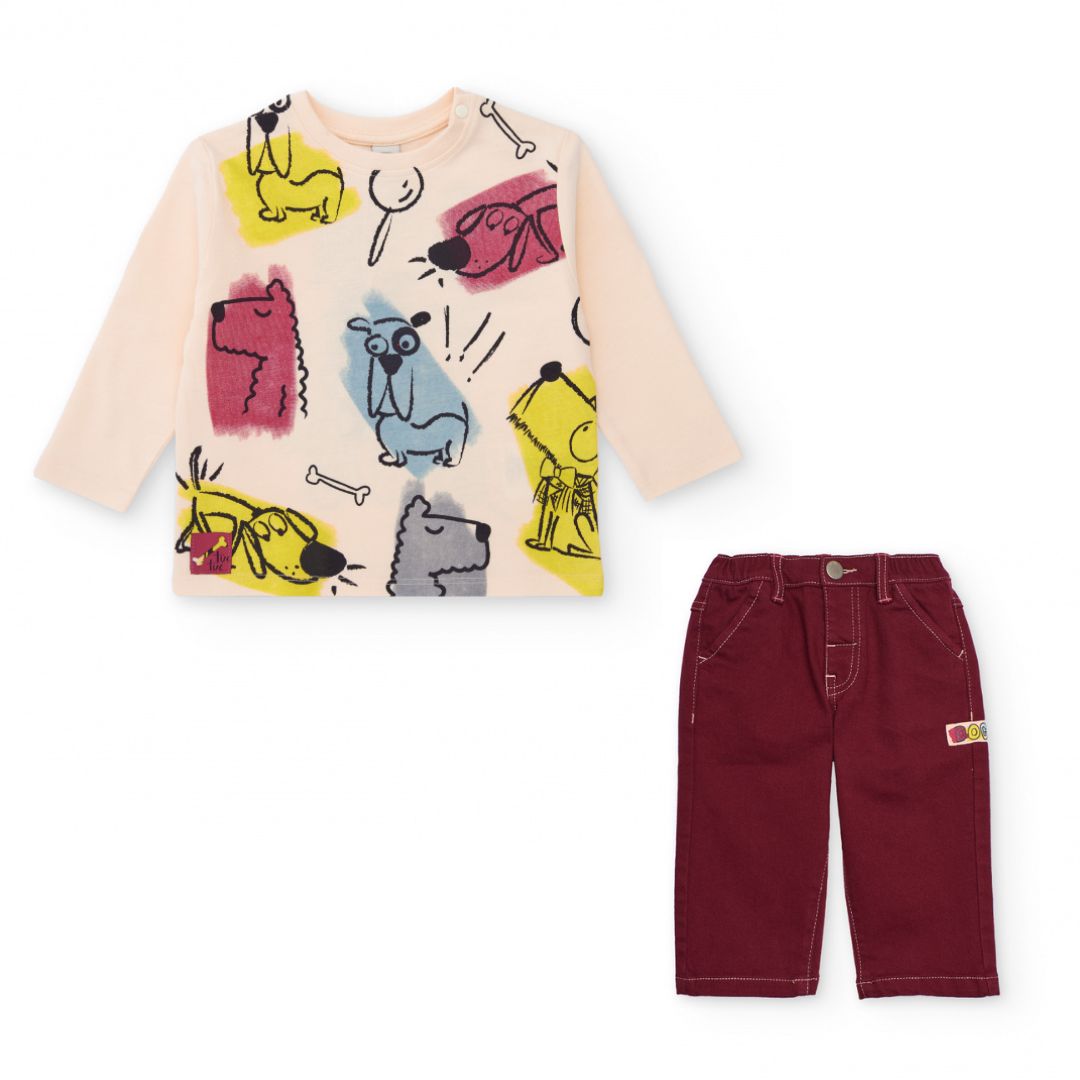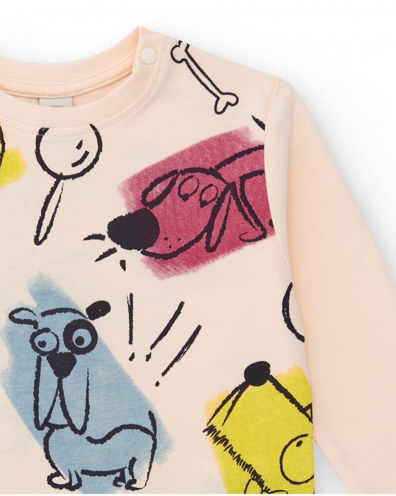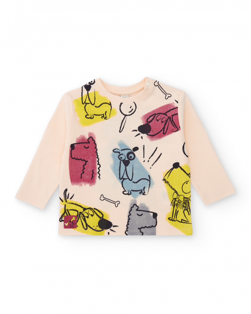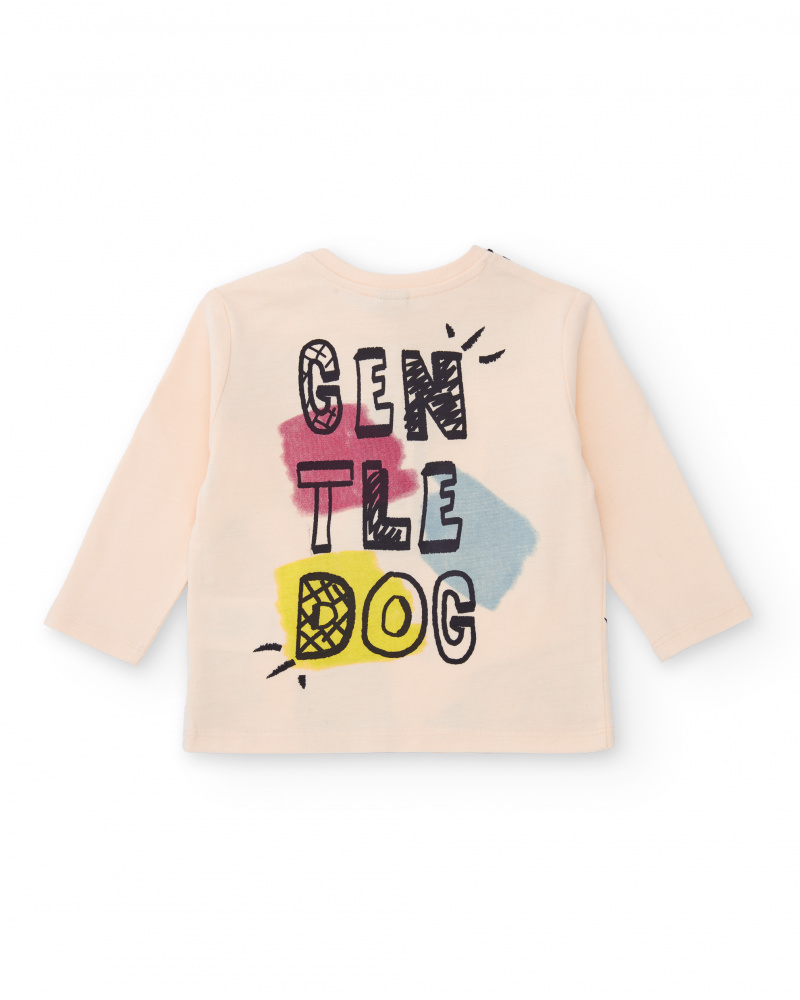 Long-sleeve T-shirt for boys in light beige, crafted from soft cotton fabric. Features a fun dog print in vibrant colors such as red, blue, and yellow, both on the front and back, with the wording “Gentle Dog” on the rear. Designed with a round neckline and snap buttons on the shoulder for easy dressing. A comfortable, practical, and cheerful garment, perfect for everyday wear.