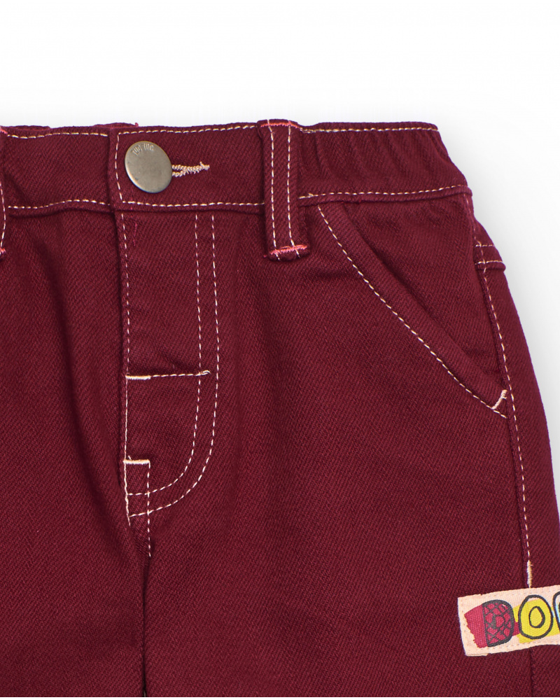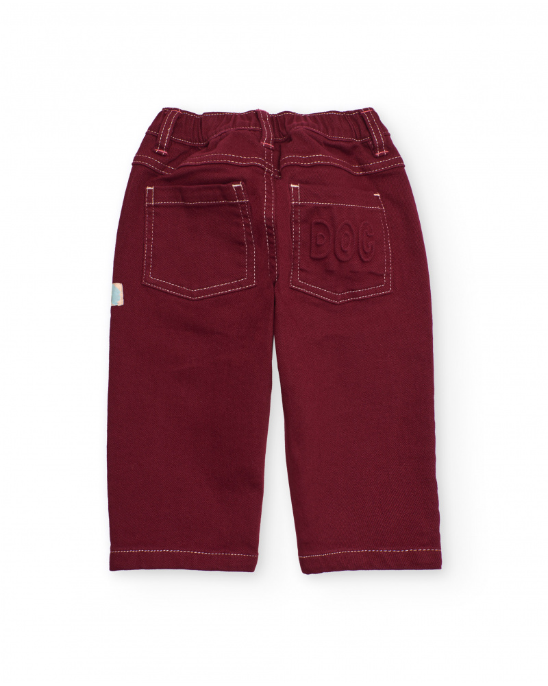Children’s pants for boys in burgundy fabric with functional pockets and embroidered “DOG” detail on the back pocket. Contrasting stitching and adjustable waistband for added comfort.