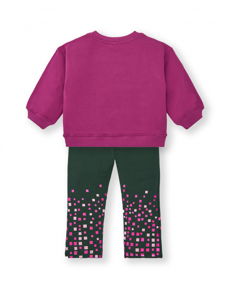 Set for girls from Tuc Tuc consisting of a fuchsia sweatshirt and green leggings. The sweatshirt features an adorable dinosaur design in pink tones, with three-dimensional details such as ears and a shiny horn, accompanied by small silver stars on the shoulder. The leggings, in a dark green tone, perfectly complement the set with a pixelated design in pink tones at the bottom and a multi-coloured elastic waistband, ensuring a comfortable fit. This set is ideal for little girls who love comfort without losing style, belonging to the Cyber Dino collection.