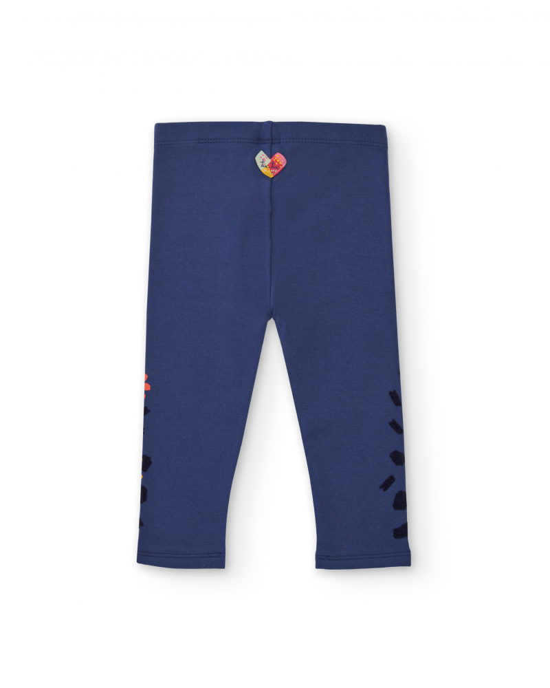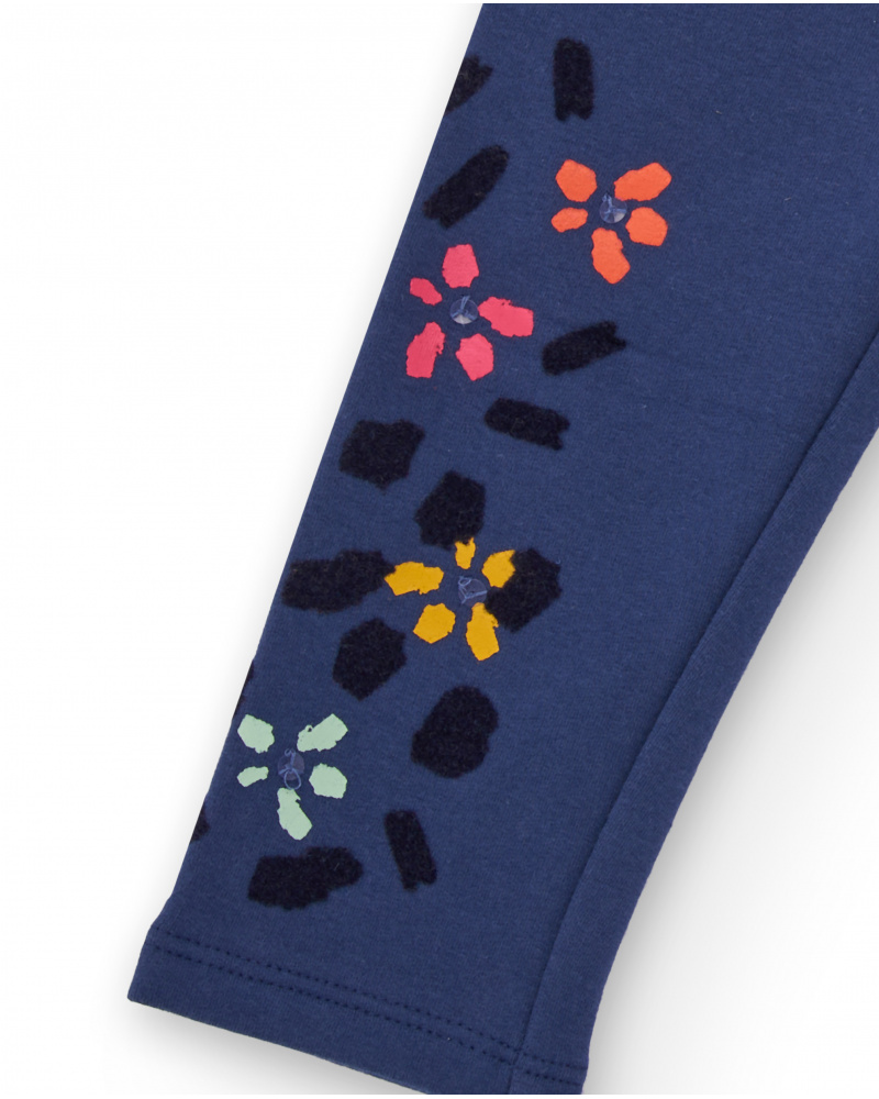 Girls’ navy blue leggings made of stretch fabric, decorated with a cheerful multicolor flower print on the lower legs.