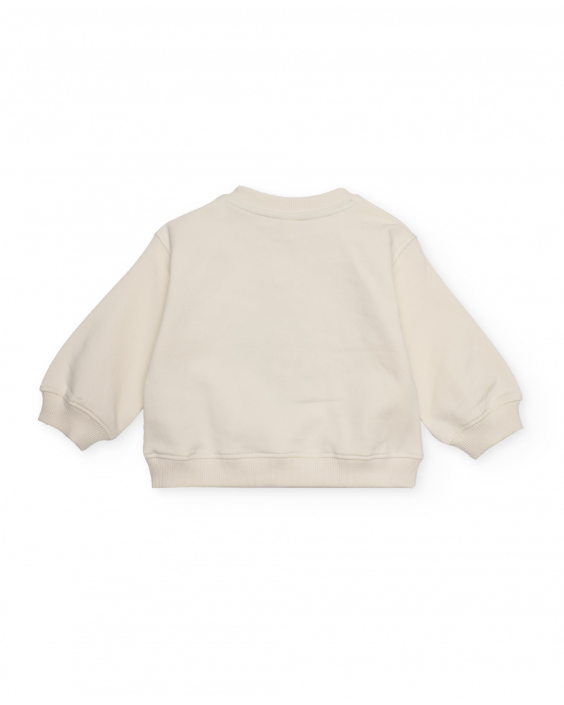 Sweatshirt for girl in cream tone, decorated with a cheerful print of colorful flowers and small hearts. Made from soft and warm fabric, ideal for cool days. Features shoulder snaps for easy dressing, elastic cuffs and waistband ensuring a comfortable fit. Perfect for providing style and comfort on any casual occasion.