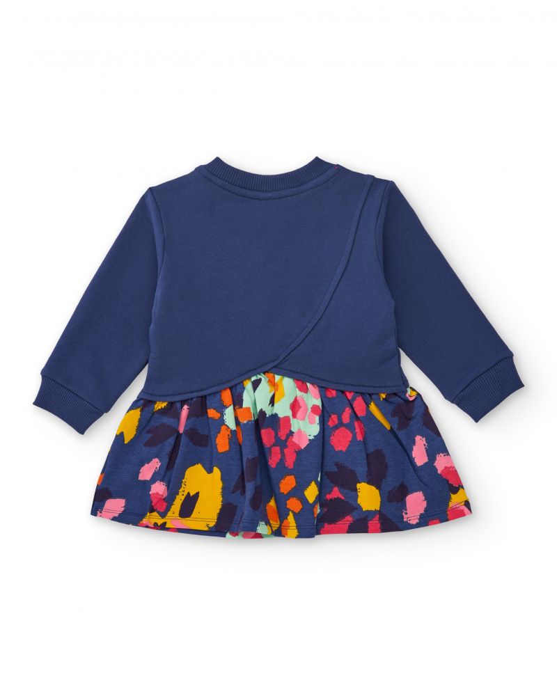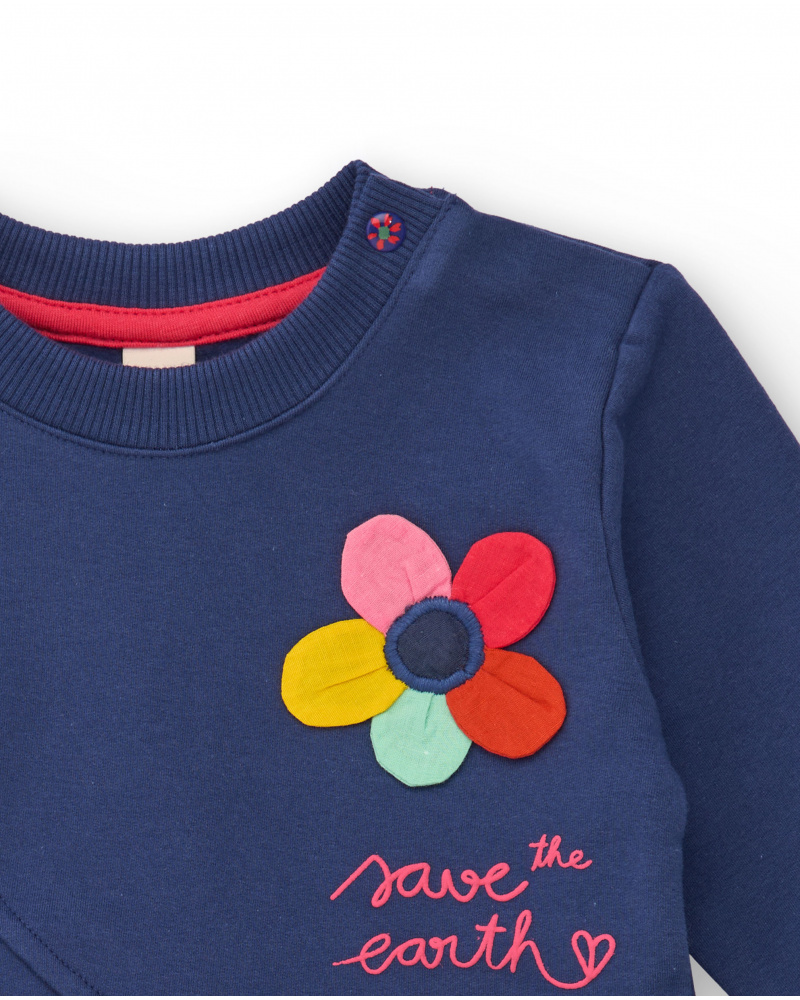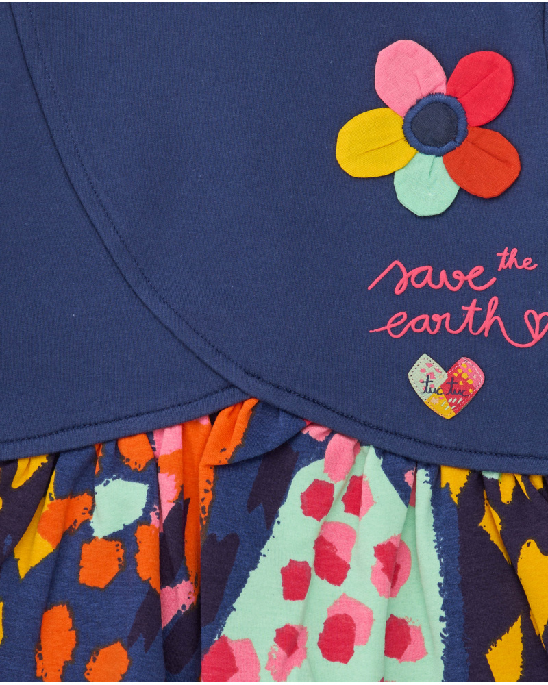 Girls’ navy blue knit dress with multicolored flower appliqué and “Save the Earth” embroidery. Skirt with vibrant spot print, long sleeves, crew neck, and side snap button on the shoulder.