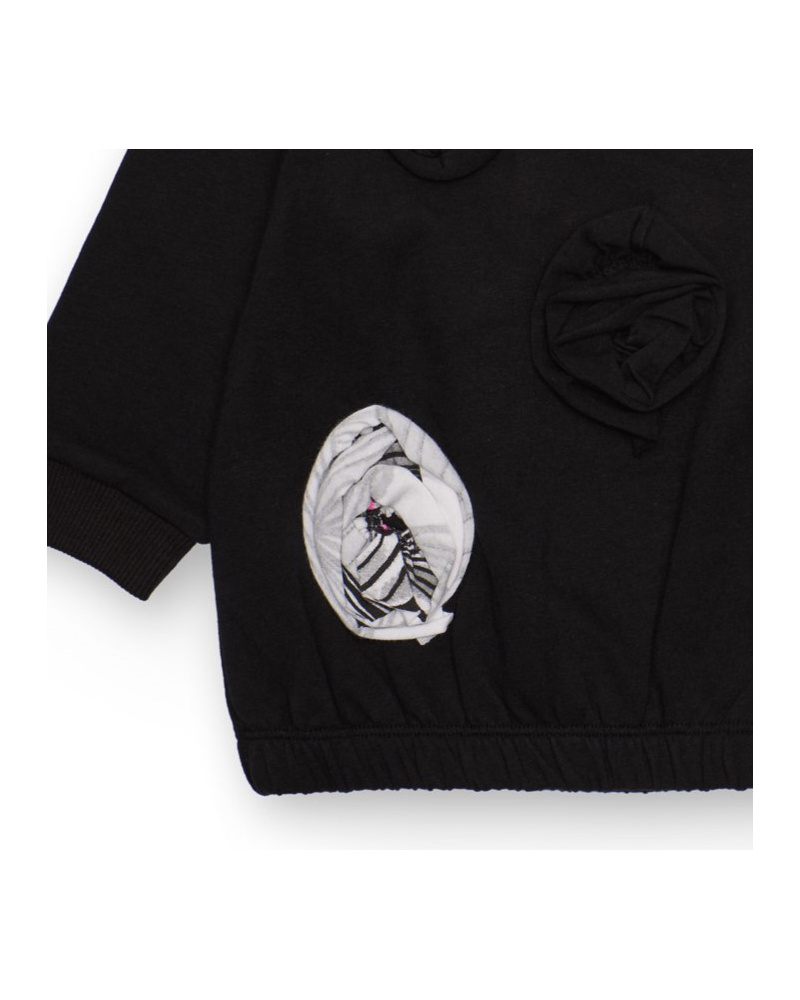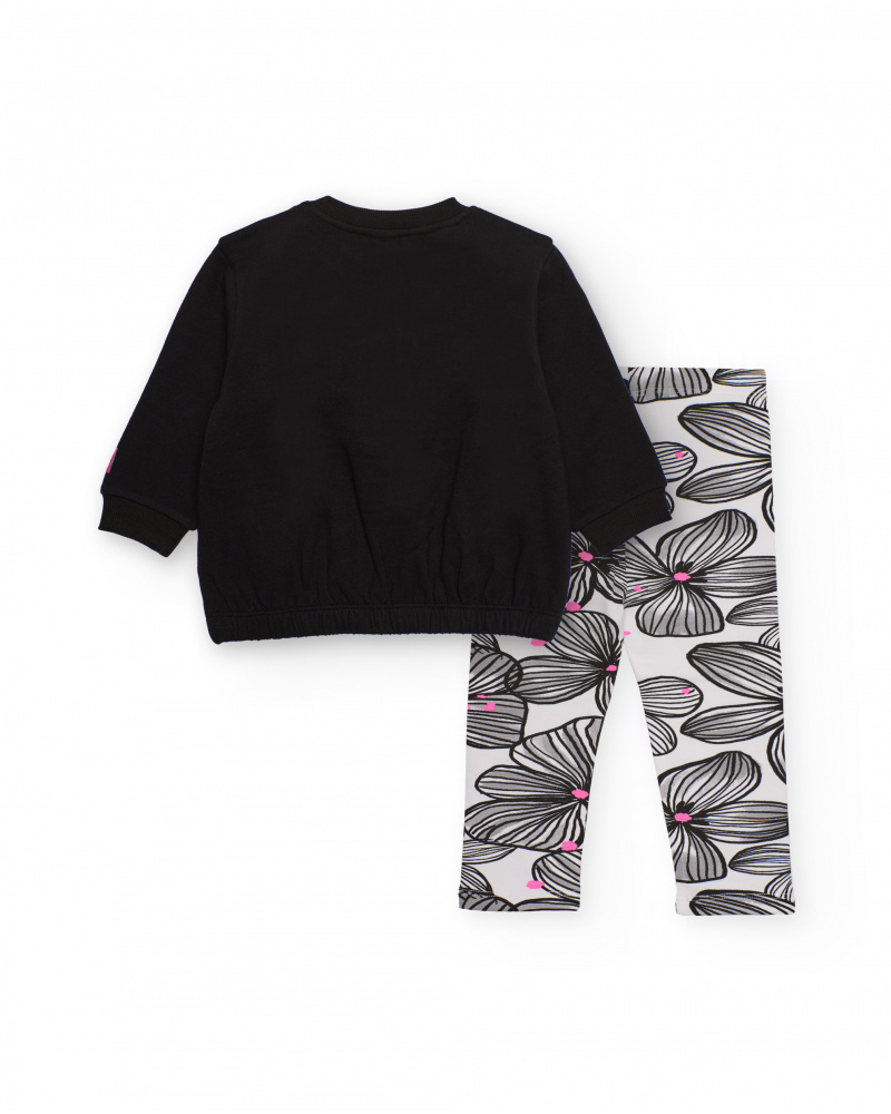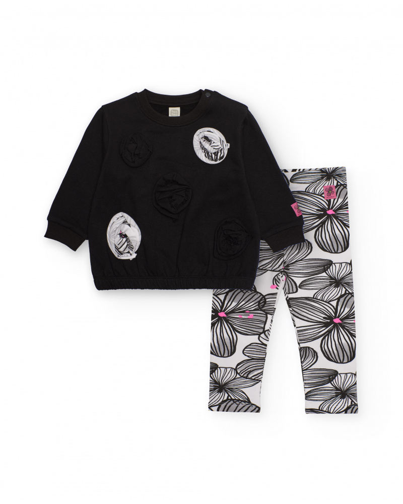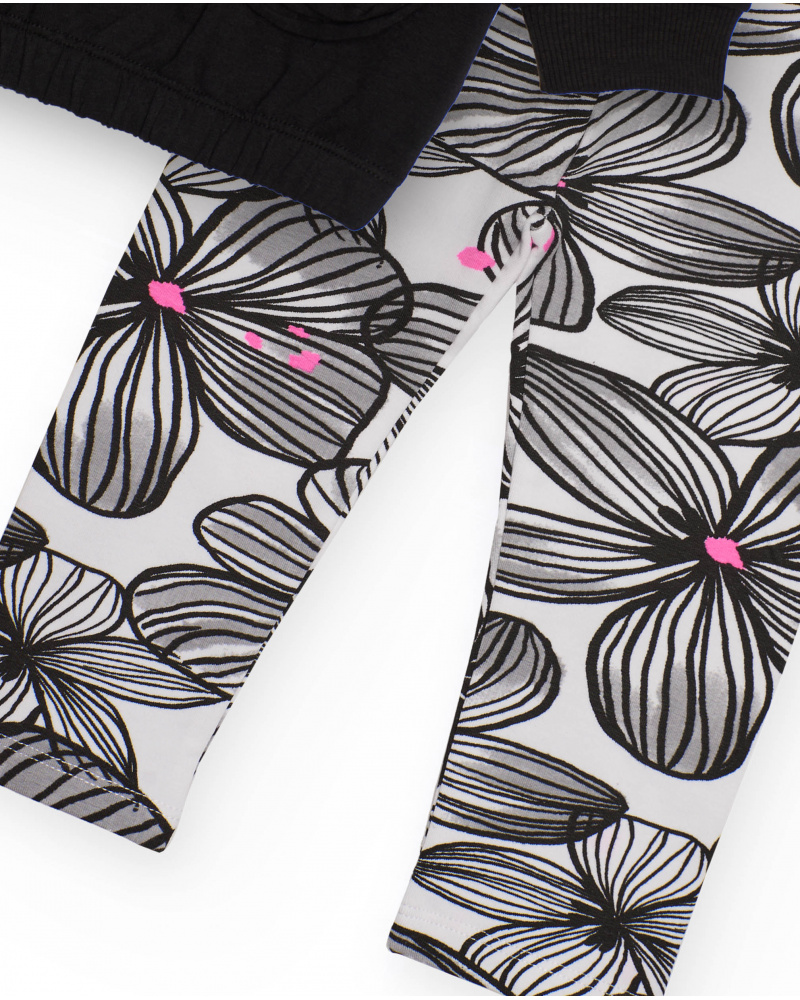 Two-piece set for girls consisting of a long-sleeved black sweatshirt and white leggings printed with black flowers and pink details. The sweatshirt features raised floral details and a gathered waist for a comfortable fit.
